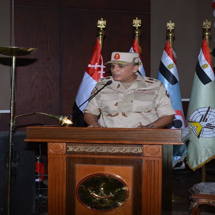 وألقى مدير كلية القادة والأركان كلمة نقل خلالها تحيات وتقدير الفريق أول / محمد زكى القائد العام للقوات المسلحة وزير الدفاع والإنتاج الحربى والفريق / أسامة عسكر رئيس أركان حرب القوات المسلحة للسادة الحضور مؤكداً أن الإحتفال باليوم الوطنى لجمهورية مصر العربية والذى يتزامن مع الذكرى الثامنة والأربعون لإنتصارات أكتوبر المجيدة عام 1973 هو توثيق للروابط ودعم أواصر الأخوة والصداقة والتعاون مشيراً إلى أن مصر ستظل دوماً مؤمنة بأجيال تتواصل وتتعاقب على تبادل المسئولية وحمل الأمانة لتظل راية الوطن خفاقة .