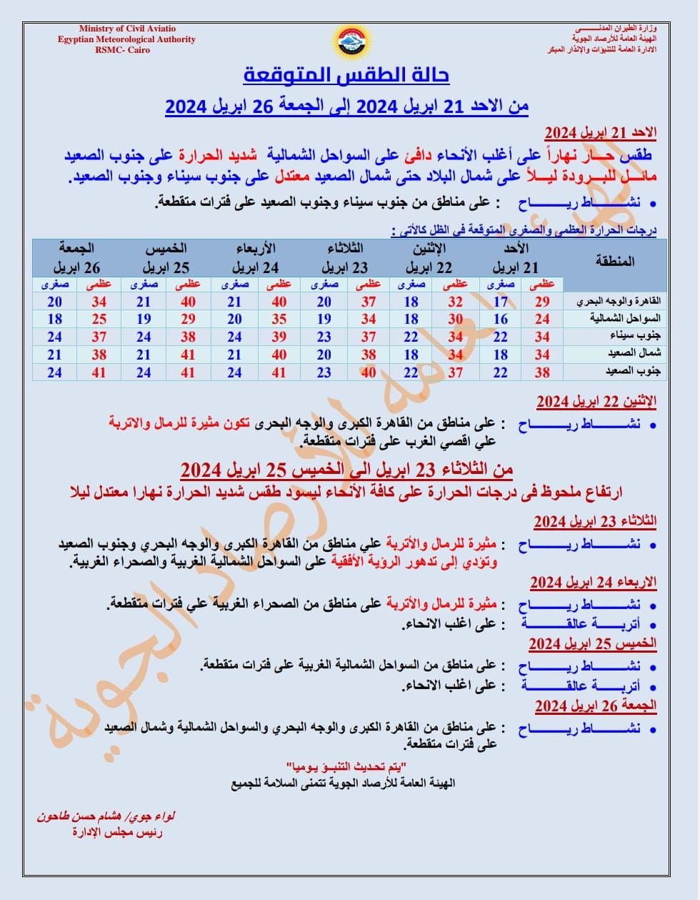ويشهد اليوم الأحد، طقسا حارا نهاراً على أغلب الأنحاء، دافئ على السواحل الشمالية، شديد الحرارة على جنوب الصعيد، مائل للبرودة ليلا على شمال البلاد حتى شمال الصعيد، معتدل على جنوب سيناء وجنوب الصعيد.