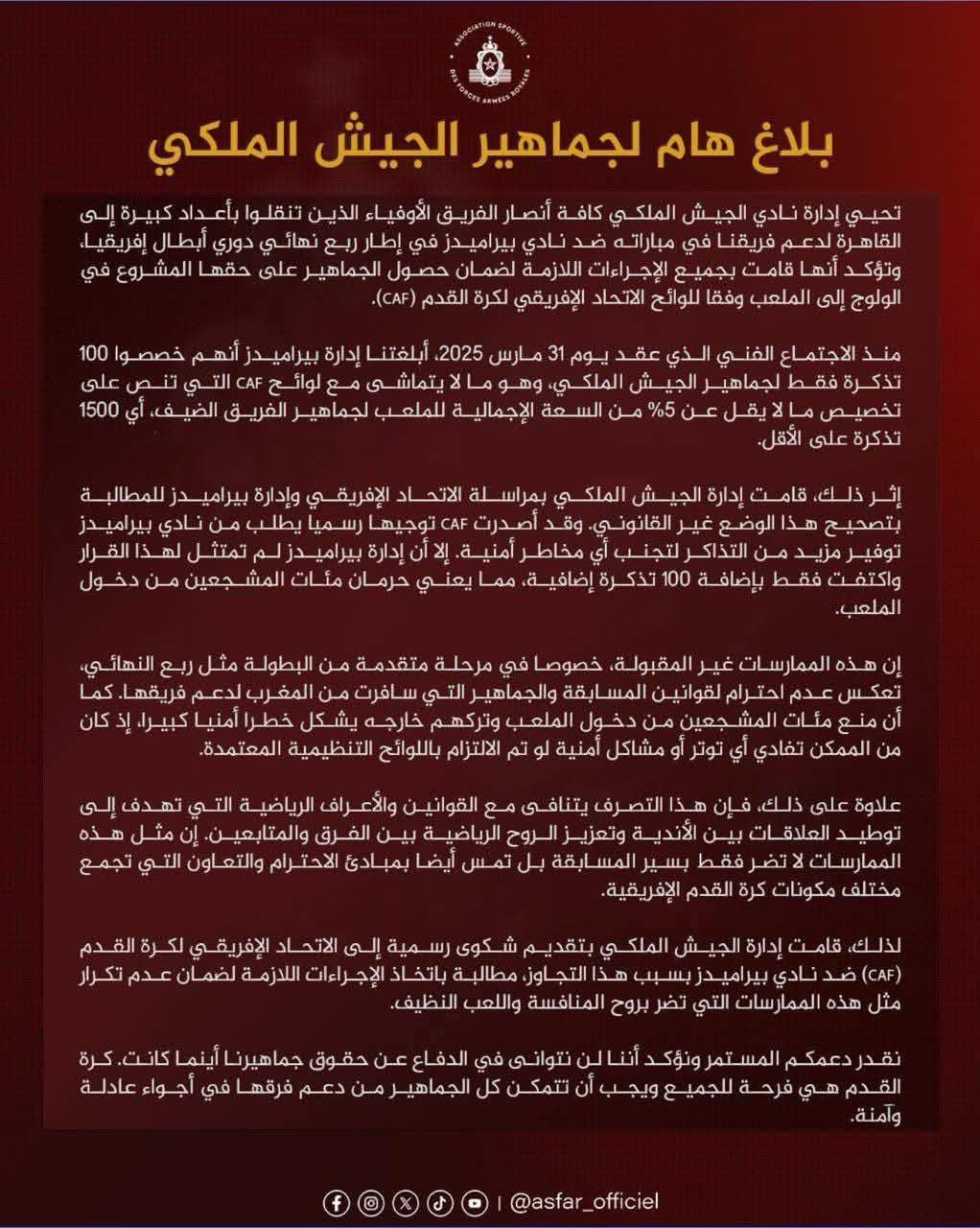 تحيي إدارة نادي الجيش الملكي كافة أنصار الفريق الأوفياء الذين تنقلوا بأعداد كبيرة إلى القاهرة لدعم فريقنا في مباراته ضد نادي بيراميدز في إطار ربع نهائي دوري أبطال إفريقيا، وتؤكد أنها قامت بجميع الإجراءات اللازمة لضمان حصول الجماهير على حقها المشروع في الولوج إلى الملعب وفقا للوائح الاتحاد الإفريقي لكرة القدم.