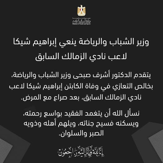 نعى الدكتور أشرف صبحي وزير الشباب والرياضة، إبراهيم شيكا لاعب الزمالك السابق، إثر تدهور حالته الصحية ووفاته عن عمر يناهز 28 عاما.
