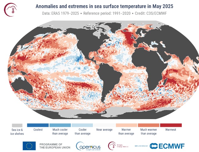 واحتلّا شهري يونيو ويوليو 2025 المركز الثالث في قائمة الأشهر الأشد حرارة، حيث بلغ متوسط يوليو 1.25 درجة فوق مستويات ما قبل الثورة الصناعية.