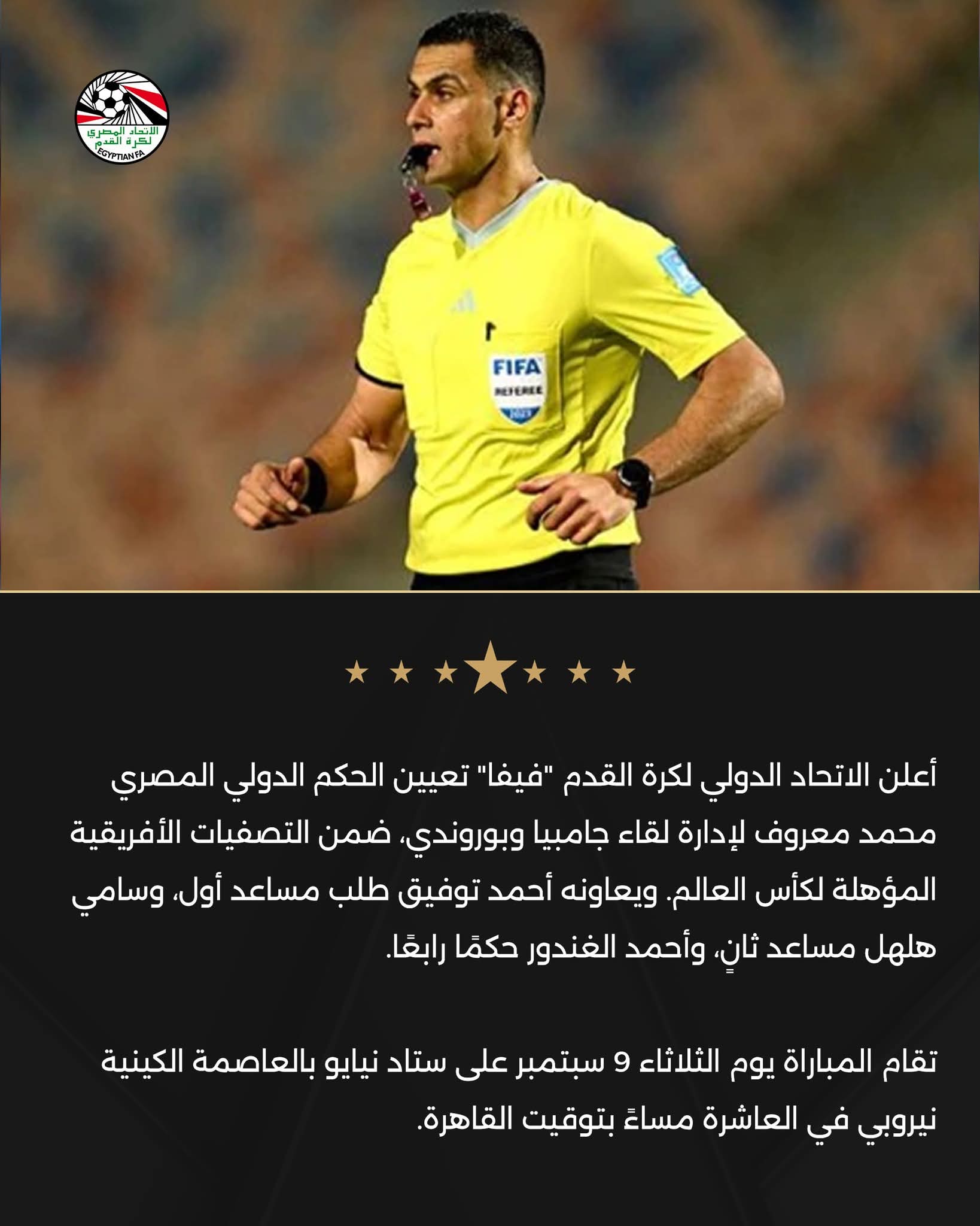 وكتبت الصفحة الرسمية للكرة المصرية:"طاقم مصري بقيادة معروف لمباراة جامبيا وبوروندي بتصفيات المونديال ".