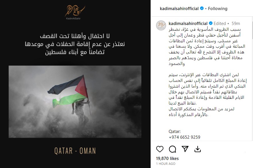 أعلن الفنان كاظم الساهر، تعليق حفلاته الغنائية المقرر إقامتها في قطر وعمان إلى أجل غير مسمى، تضامنًا مع فلسطين، مشيرًا إلى إعادة ثمن البطاقات المباعة، وذلك من خلال نشر صورة لعلم فلسطين عبر حسابه الرسمي على موقع تبادل الصور والفيديوهات الشهير "انستجرام"، مرفقة بتعليق: "لا احتفال وأهلنا تحت القصف".