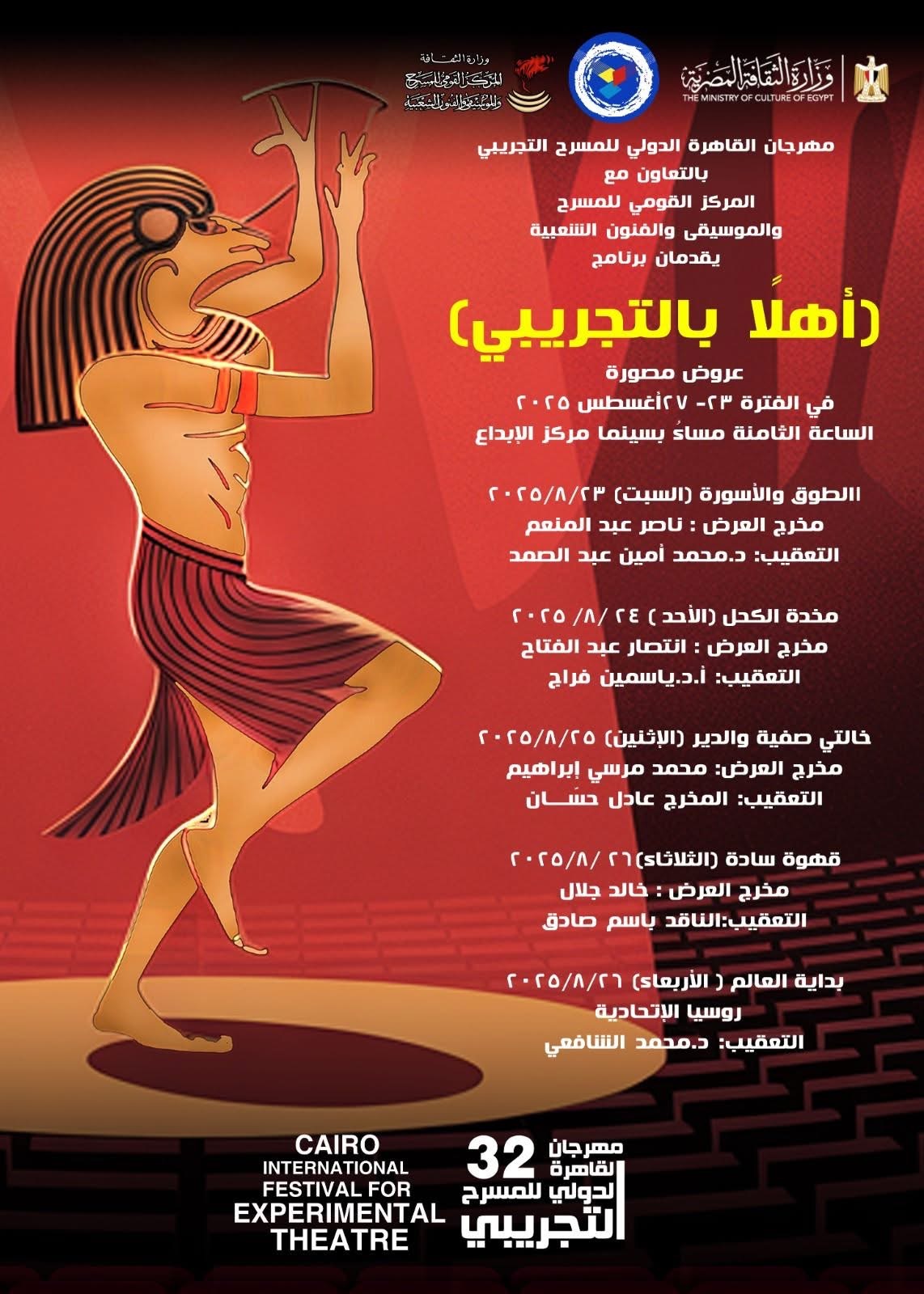 يقدم المركز القومي للمسرح والموسيقي والفنون الشعبية، قبل انطلاق فعاليات الدورة الـ 32 لمهرجان القاهرة الدولي للمسرح التجريبي، لجمهور المهرجان خمسة تسجيلات مرئية لعروض مختارة من تراث المهرجان، على شاشة سينما مركز الإبداع التابع لصندوق التنمية الثقافية بساحة دار الأوبرا، البرنامج الاستعادي الذي يحمل اسم "أهلا بالتجريبي " سيقام بالتنسيق مع إدارة مهرجان القاهرة الدولي للمسرح التجريبي خلال الفترة من 23 وحتى 26 أغسطس الجاري، وسيعقب كل عرض لقاء مع مخرج العمل، وتعقيب نقدي يتناوب على تقديمه عدد من كبار نقاد المسرح.