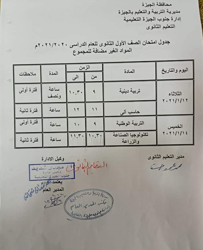 تنشر الدفاع العربي، جدول امتحانات الصف الأول الثانوي بمحافظة الجيزة، حيث اعتمد ناصر شعبان، مدير إدارة جنوب الجيزة التعليمية، جدول امتحانات أولى ثانوى، للمواد الغير مضافة للمجموع، والتي سوف تبدأ في 12 يناير من العام الجديد 2021، وتنتهى في 14 يناير.
