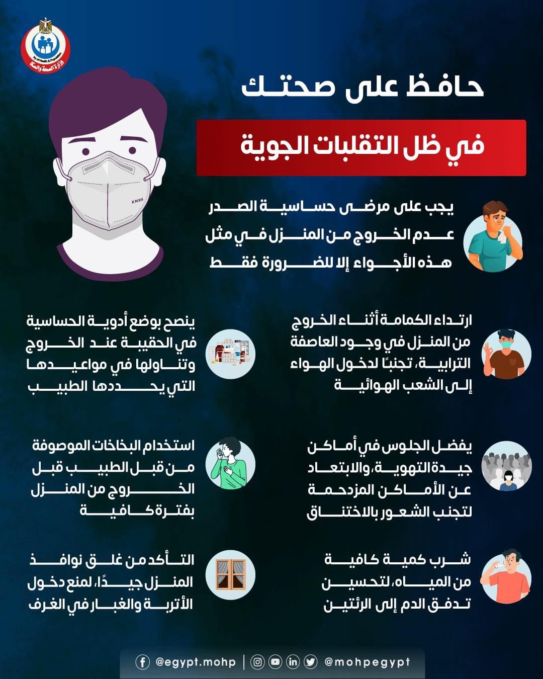 وجهت وزارة الصحة والسكان مجموعة من النصائح الهامة للوقاية من الأضرار الصحية الناتجة عن التقلبات الجوية، وتشمل هذه النصائح ما يلي: