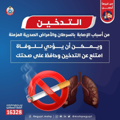 وأكدت الوزارة، أن الدخان الصادر من المدخنين، يعرض كل من المدخن والمدخن السلبى لأضراره، حيث يسبب سرطان الرئة، ويزيد من مخاطر الإصابة بأمراض القلب التاجية، لافتة إلى أن التدخين السلبى يتسبب فى وقوع 100 ألف وفاة مبكرة سنويا من غير المدخنين، من الرجال والنساء والأطفال، موضحة أن دخان التبغ يحتوى على آلاف من المواد الكيميائية المعروفة، منها 40 مادة تسبب السرطان