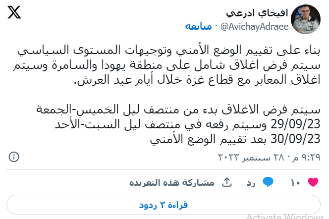 قال المتحدث باسم الجيش الإسرائيلي أفيخاي أدرعي عبر حسابه الرسمي على منصة التغريدات القصيرة X (تويتر سابقاً)، إن الإغلاق سيسري بدءاً من منتصف ليل الخميس-الجمعة 29 سبتمبر حتى منتصف ليل السبت-الأحد 30 سبتمبر، بعد تقييم الوضع الأمني.