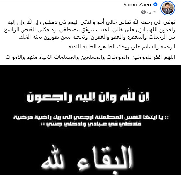 أعلن الفنان سامو زين، وفاة خاله، عبر حسابه الرسمي على موقع التواصل الإجتماعي "فيس بوك" وكتب قائلًا ": توفي الي رحمه الله تعالي خالي أخو والدتي اليوم في دمشق، إن لله وإن إليه راجعون اللهم أنزل على خالي الحبيب موفق مصطفي اللهم له الفيض الواسع من الرحمات والمغفرة والعفو والغفران، وتجعله ممن يفوزون بجنة الخلد، الرحمه والسلام علي روحك الطاهره الطيبه النقيه ".