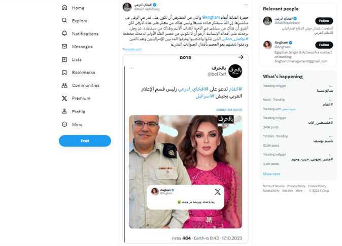 هاجم أفيخاي أدرعي المتحدث الرسمي لجيش الاحتلال الإسرائيلي الفنانة أنغام من خلال حسابه على موقع التدوينات القصيرة "اكس" تويتر سابقًا، بعدما كتبت بوست قالت فيه: "ربنا ياخدك ويريحنا من وشك"، وذلك عقب تدويناته التى أشار فيها إلى ضرب غزة وسكانها من قبل جيش الاحتلال.