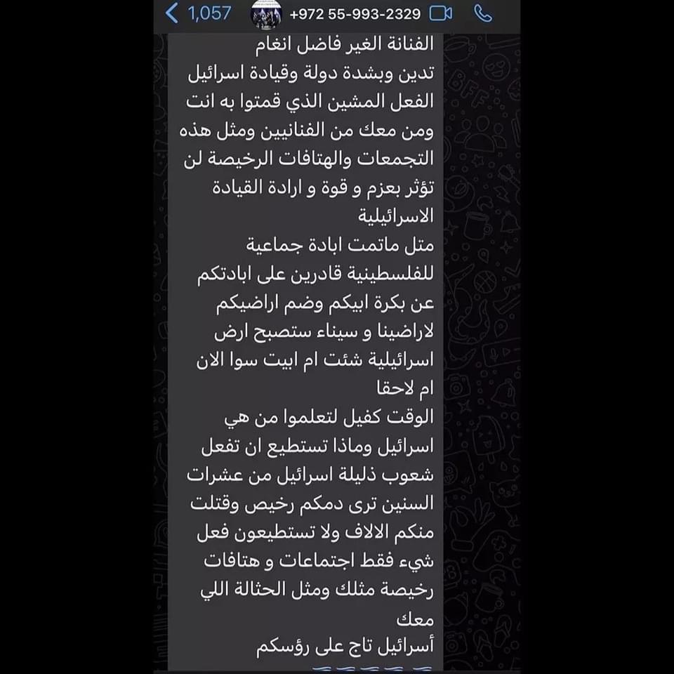 أنغام تتلقى رسالة تهديد من أفيخاي أدرعي