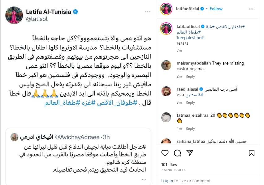 ونشرت النجمة لطيفة عبر حسابها الرسمي على موقع التدوينات القصيرة "إكس ،تويتر سابقا"، تدوينة قائلة :"هو انتو عمي ولا بتستعموا؟.. كل حاجه بالخطأ، مستشفيات بالخطأ؟ مدرسة الأونروا كلها أطفال بالخطأ؟.. النازحين إلى هجرتوهم من بيوتهم وقصفتوهم في الطريق بالخطأ.