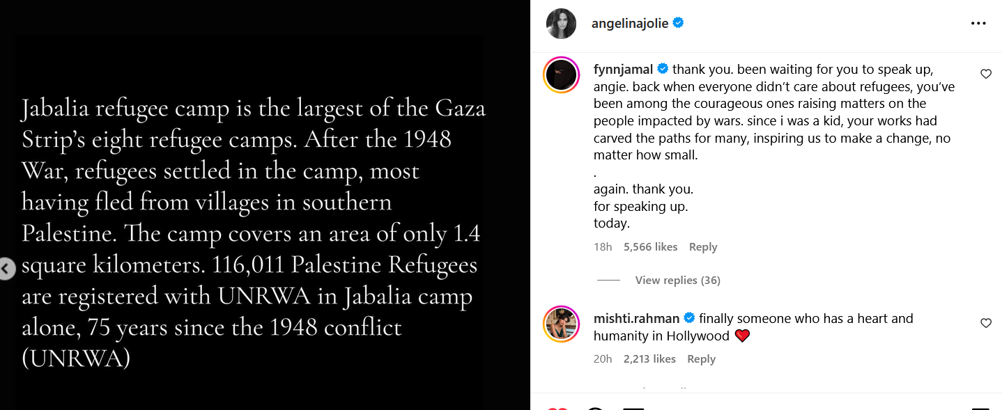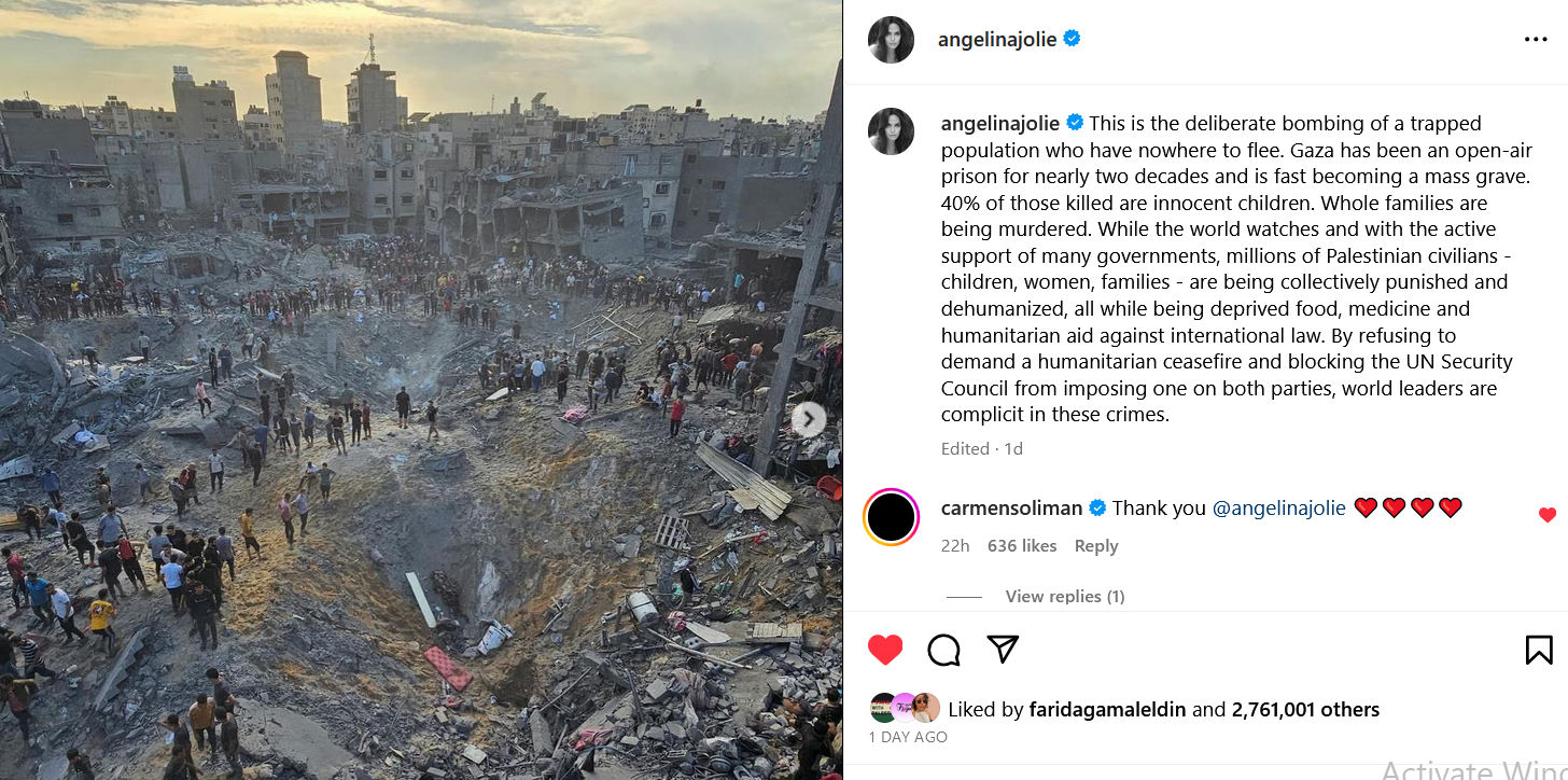 ونشرت انجلينا جولي عبر حسابها الرسمي بموقع التواصل الاجتماعي "انستجرام"، صورة لمجزرة "مخيم جباليا"، والذي قصفته إسرائيل مؤخرًا وأسفر عن استشهاد أكثر من 400 شخص والالاف الاصابات، والمفقودين تحت الأنقاض، وعلقت على الصورة قائلة:"هذا هو القصف المتعمد للسكان المحاصرين الذين ليس لديهم مكان يفرون إليه.. لقد ظلت غزة بمثابة سجن مفتوح منذ ما يقرب من عقدين من الزمن، وتتحول بسرعة إلى مقبرة جماعية".
