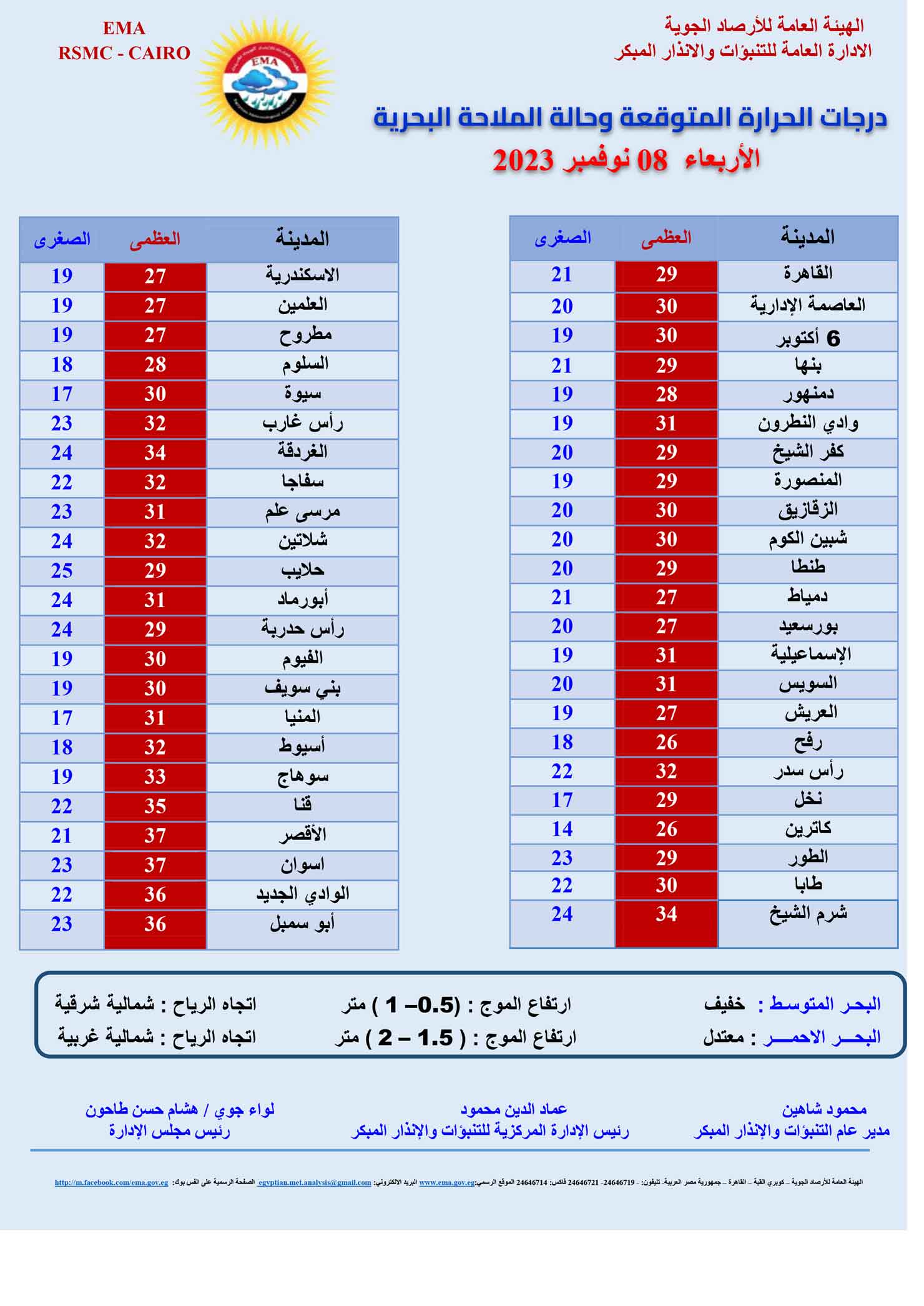 قالت هيئة الأرصاد الجوية إن حركة الملاحة البحرية على البحر المتوسط والأحمر معتدلة، ويتراوح ارتفاع الأمواج على المتوسط من 1,5 :1 متر، و على البحر الأحمر فهي معتدلة، وارتفاع الأمواج من 0,5 :1 متر.