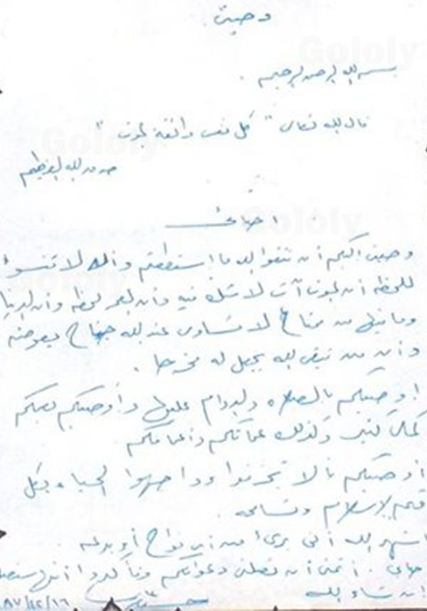 وأضاف: «أوصيكم بالصلاة والدوام عليها وأوصيكم بعمكم كمال كثيرًا وكذلك عماتكم وأعمامكم، وأوصيكم بالا تحزنوا وواجهوا الحياة بكل قيم الإسلام وتسامحه»، وأختتمها قائلًا: «أشهد الله أني برئ من أي نواح أو بدعه، أحبائي أتمنى أن تصلني دعواتكم وتأكدوا أنها ستصلني إن شاء الله، حسن عابدين 16/12/1987».