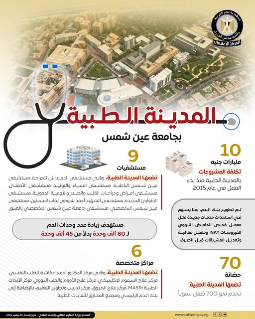 نشر المركز الاعلامي لمجلس الوزراء تقريرا يرصد تطوير المدينة الطبية بجامعة عين شمس بتكلفة 10 مليارات جنيه.
