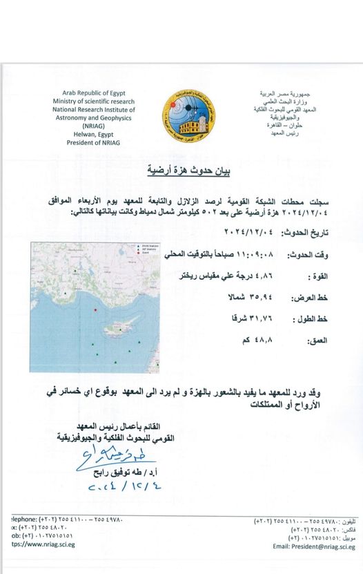 سجلت محطات الشبكة القومية لرصد الزلازل، والتابعة للمعهد، هزة أرضية بقوة 4.8 درجة على مقياس ريختر شمال غرب قبرص، على بعد 502 كم من دمياط، حسبما صرح الدكتور طه رابح، رئيس المعهد القومي للبحوث الفلكية.