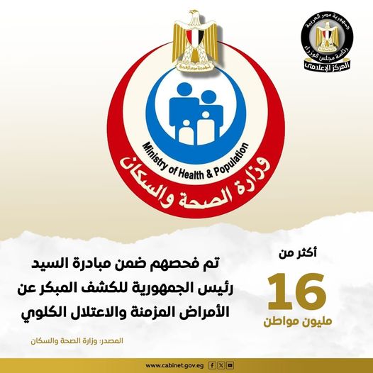 أعلنت وزارة الصحة والسكان، اليوم الجمعة، أنه تم فحص أكثر من 16 مليون مواطن ضمن مبادرة الكشف المبكر عن الأمراض المزمنة والاعتلال الكلوي.