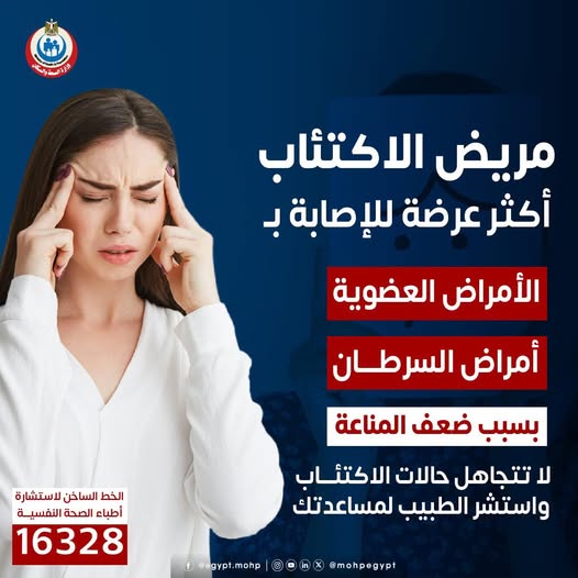 قالت وزارة الصحة والسكان، إن مريض الاكتئاب أكثر عرضة للإصابة بأمراض عضوية ومناعية مثل السرطان بسبب ضعف مناعته، لذلك لا تتجاهل حالات الاكتئاب التي تمر بها واستشر الطبيب فورًا.