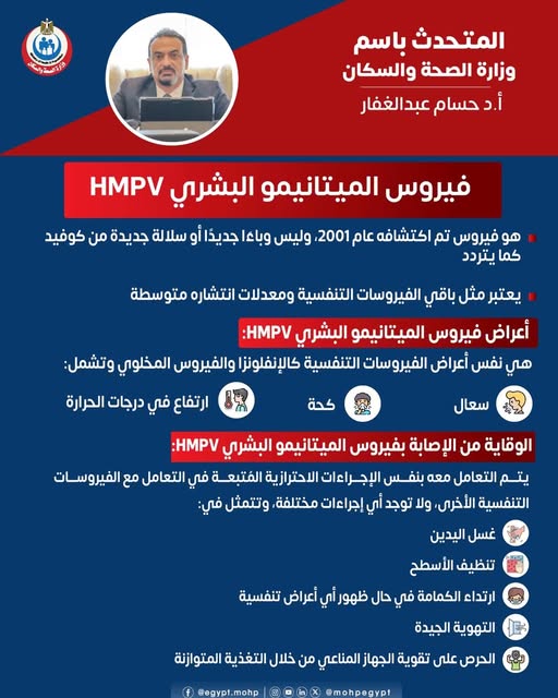 صرح د. حسام عبدالغفار، المتحدث باسم وزارة الصحة، عن فيروس الميتانيمو البشري HMPV، انه ليس فيروس جديد بل تم اكتشافه عام 2001، كما نفى أن فيروس HMPV من سلالة جديدة من «كوفيد» كما يتردد، ويعتبر مثل باقي الفيروسات التنفسية ومعدلات انتشاره متوسطة.