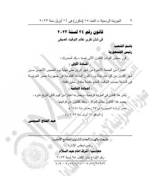 ونشرت الجريدة الرسمية قانون رقم ٢٤ لسنة ٢٠٢٣ بشأن تقرير نظام التوقيت الصيفي.