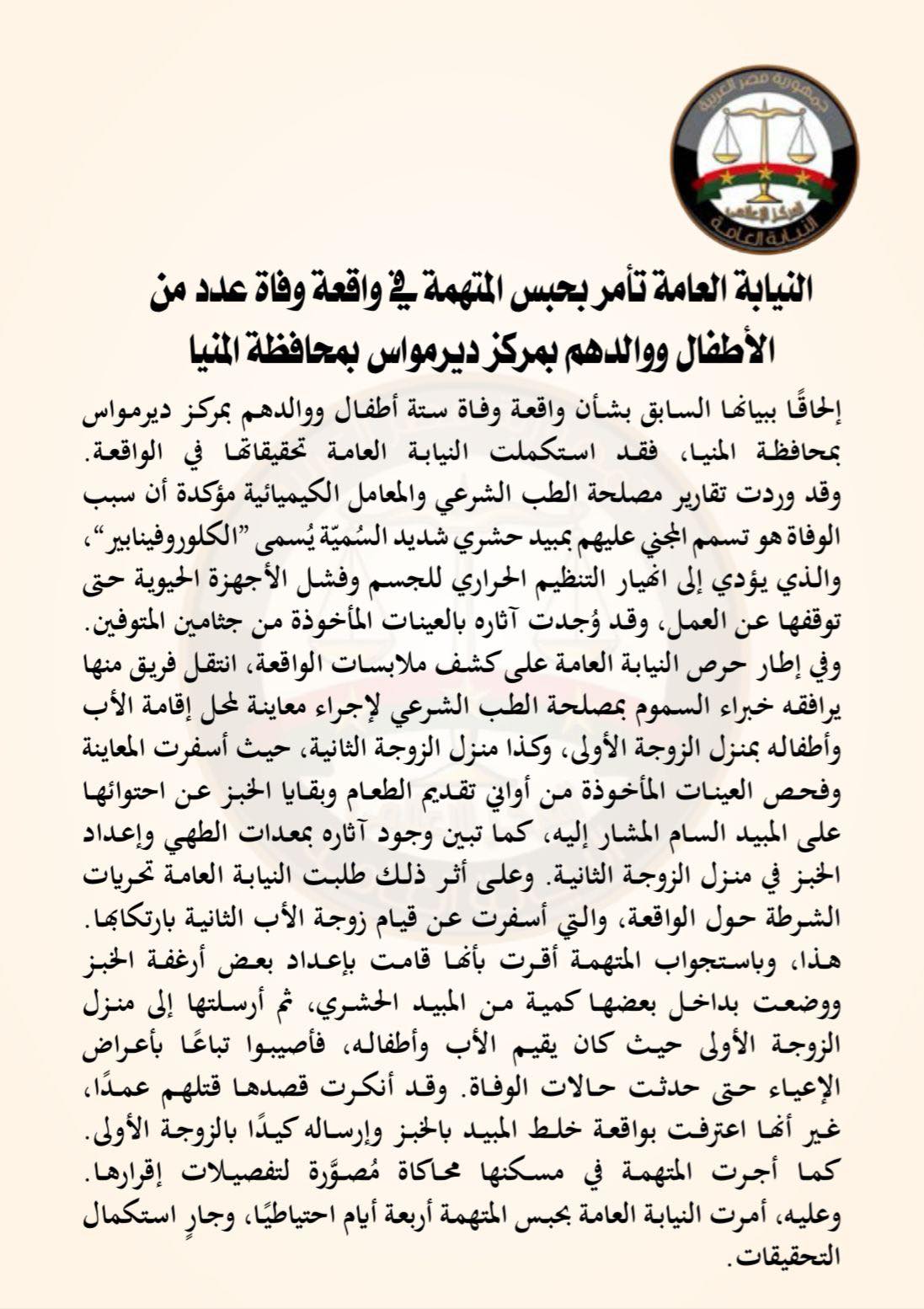 النيابة العامة تكشف سبب وفاة ستة أطفال ووالدهم بالمنيا: تسمم بمبيد حشري واعتراف الزوجة الثانية