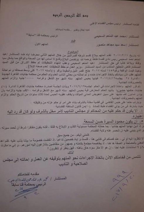 قام المستشار محمد السحيمى نجل المستشار الراحل عبد المنعم السحيمى بتقديم شكوى لمجلس القضاء الأعلى قيدت برقم 999 بتاريخ 20 / 9 / 2017 طالب فيها المجلس باستعمال صلاحياته المنصوص عليها بقانون السلطة القضائية ضد المستشار سعد سيد مجاهد منصور رئيس بمحكمة استئناف القاهرة بإحالته ” للصلاحية” بناءً على الحكم الصادر ضده من محكمة جنايات القاهرة الجديدة، والذى يأيد الحكم المعارض فيه بحبسه بسبب ابلاغه كذباً ضد المستشار الراحل عبد المنعم السحيمى رئيس نادى قضاة طنطا ”السابق” .